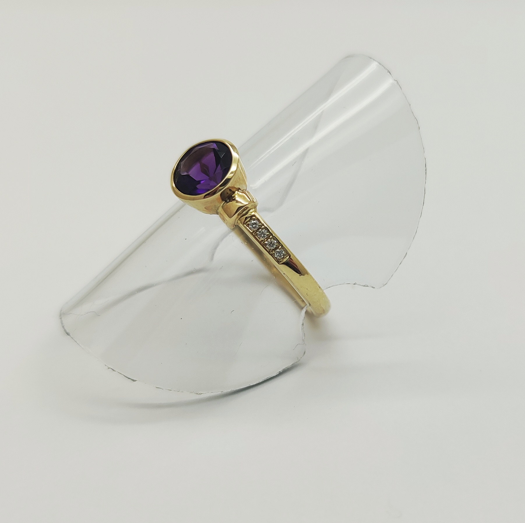 Een geelgouden ring met amethist, en twee rijtjes pavé diamanten aan de zijkant. Geheel in 14 karaat geelgoud gemaakt.